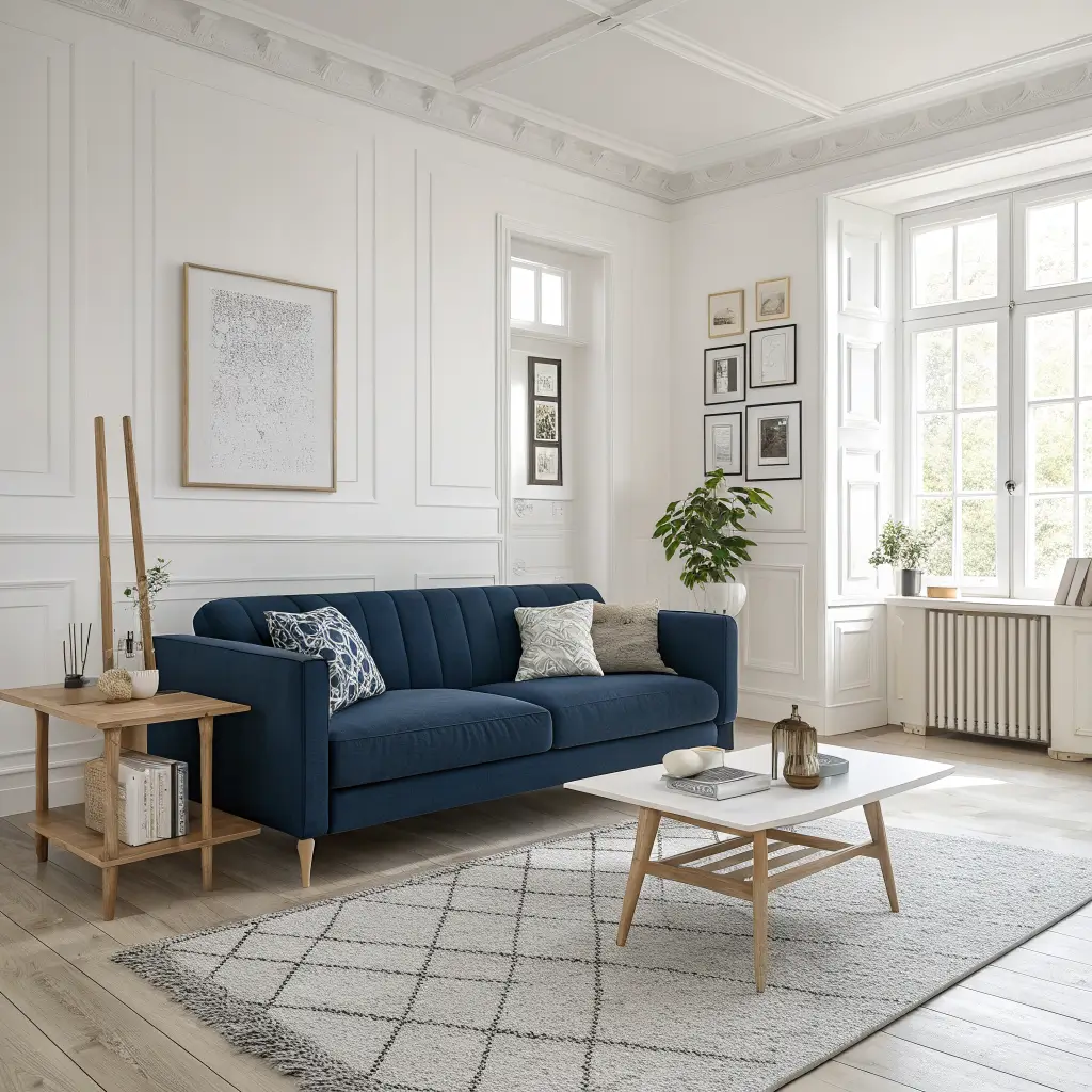 Keep walls bright white and floors light (blonde wood or white-washed if possible). Your navy sofa becomes the room’s anchor, grounding all that lightness. Add layers of neutral textures – chunky knits, faux fur, linen – to create that distinctly Scandinavian coziness without cluttering the space.