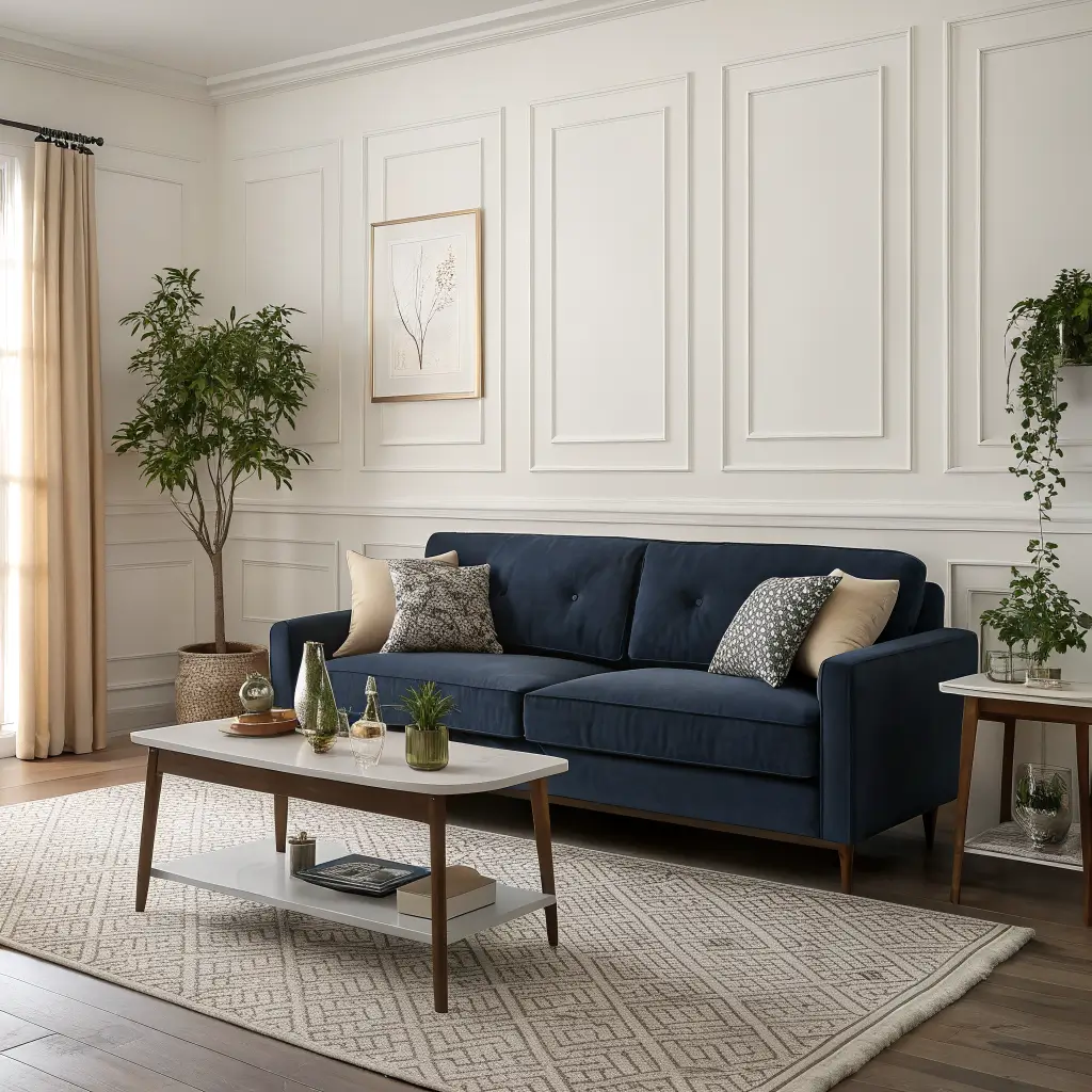 The trick is keeping everything else light and airy. Paint walls white or the palest grey. Choose a glass coffee table that virtually disappears. Mount your TV on the wall instead of using a console. Your navy couch becomes the intentional focal point while everything else supports without adding visual weight.