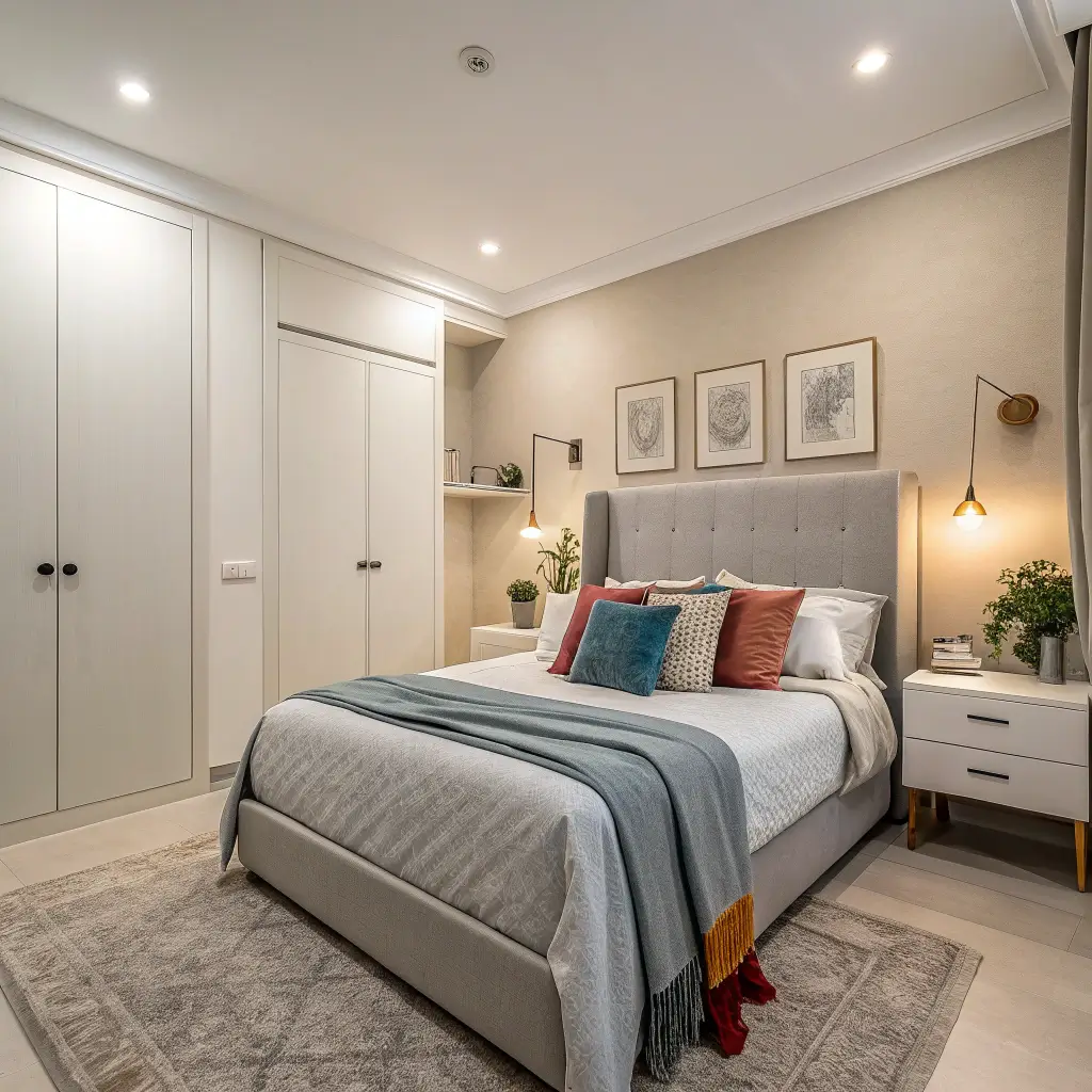 The 80/20 rule works perfectly here – 80% neutral, 20% pop. Any more and you lose that calm bedroom vibe.
