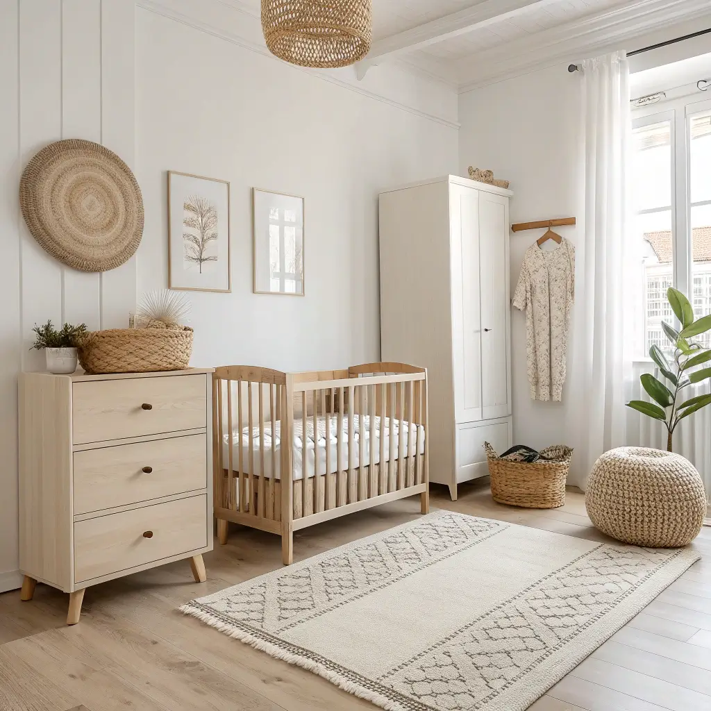 The Scandinavian approach layers natural textures like wool, linen, and wood to create depth without relying on bold colors. Picture a white-washed wooden crib, a sheepskin rug draped over a rocking chair, and soft knit blankets casually arranged in a woven basket.