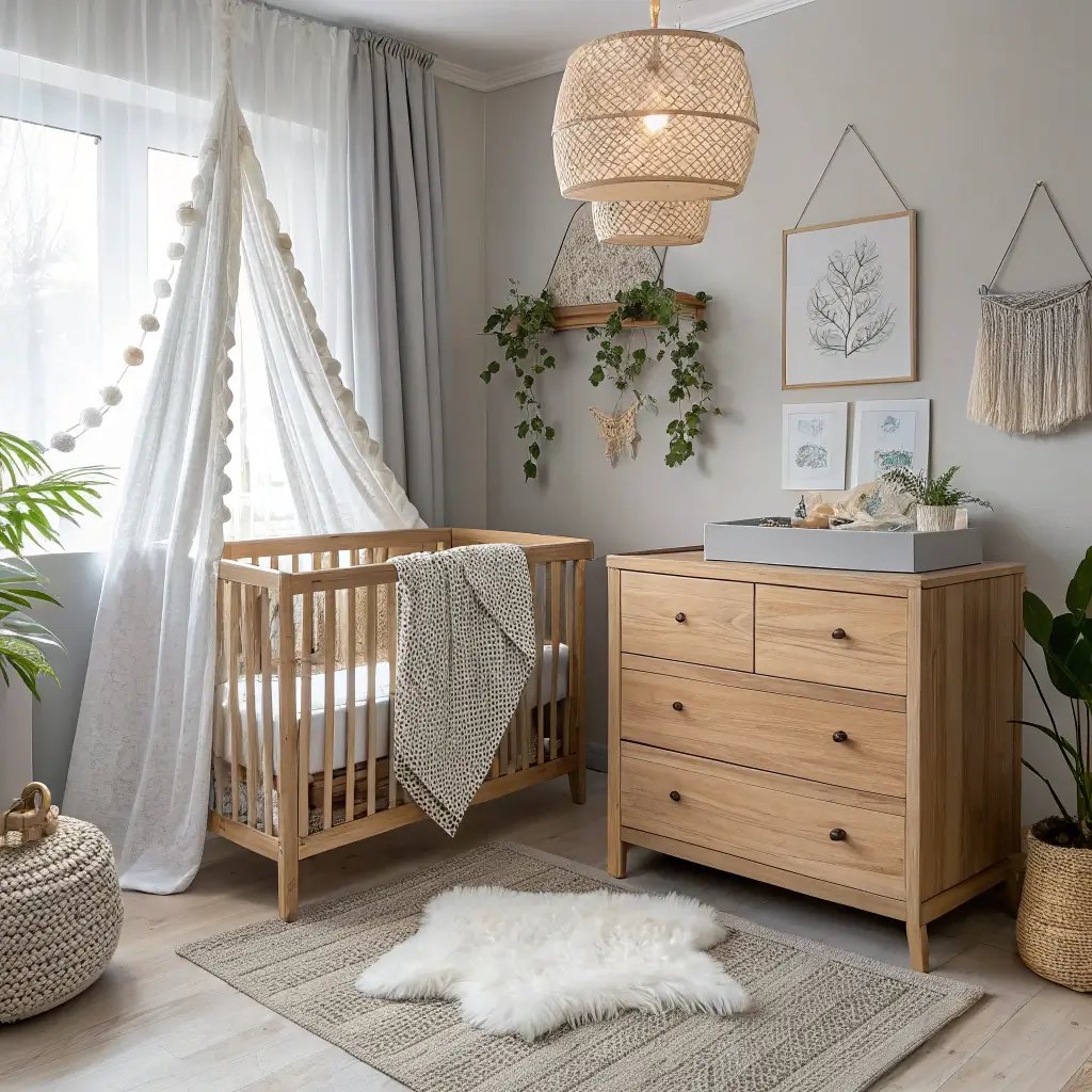 Here’s where things get fun. Modern boho takes all those free-spirited vibes and tones them down just enough to create a nursery that’s both whimsical and sophisticated.