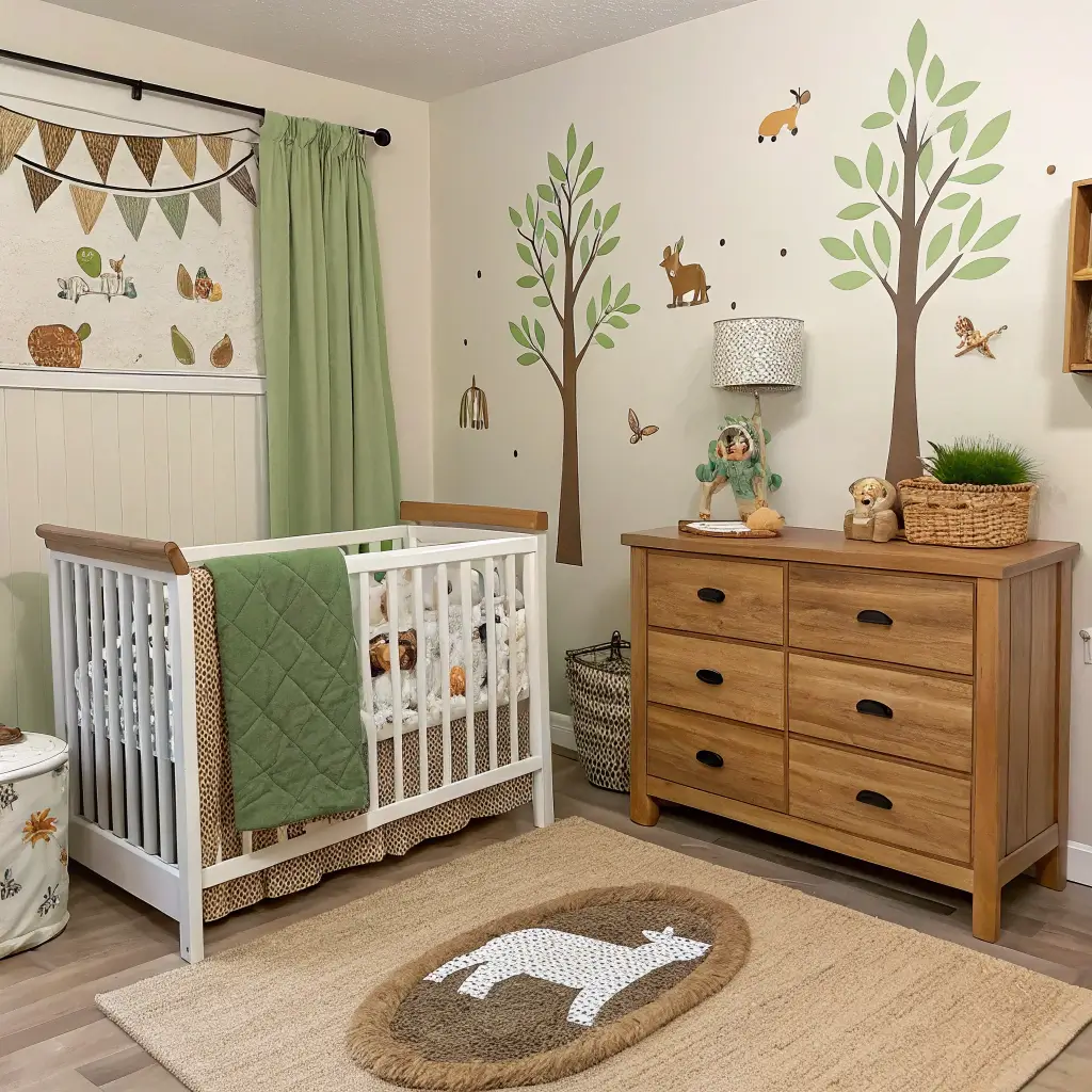 Natural wood elements shine here. A live-edge shelf, branch curtain rods, or a tree stump side table bring the outdoors in authentically. These pieces often become conversation starters – way more interesting than typical nursery furniture.