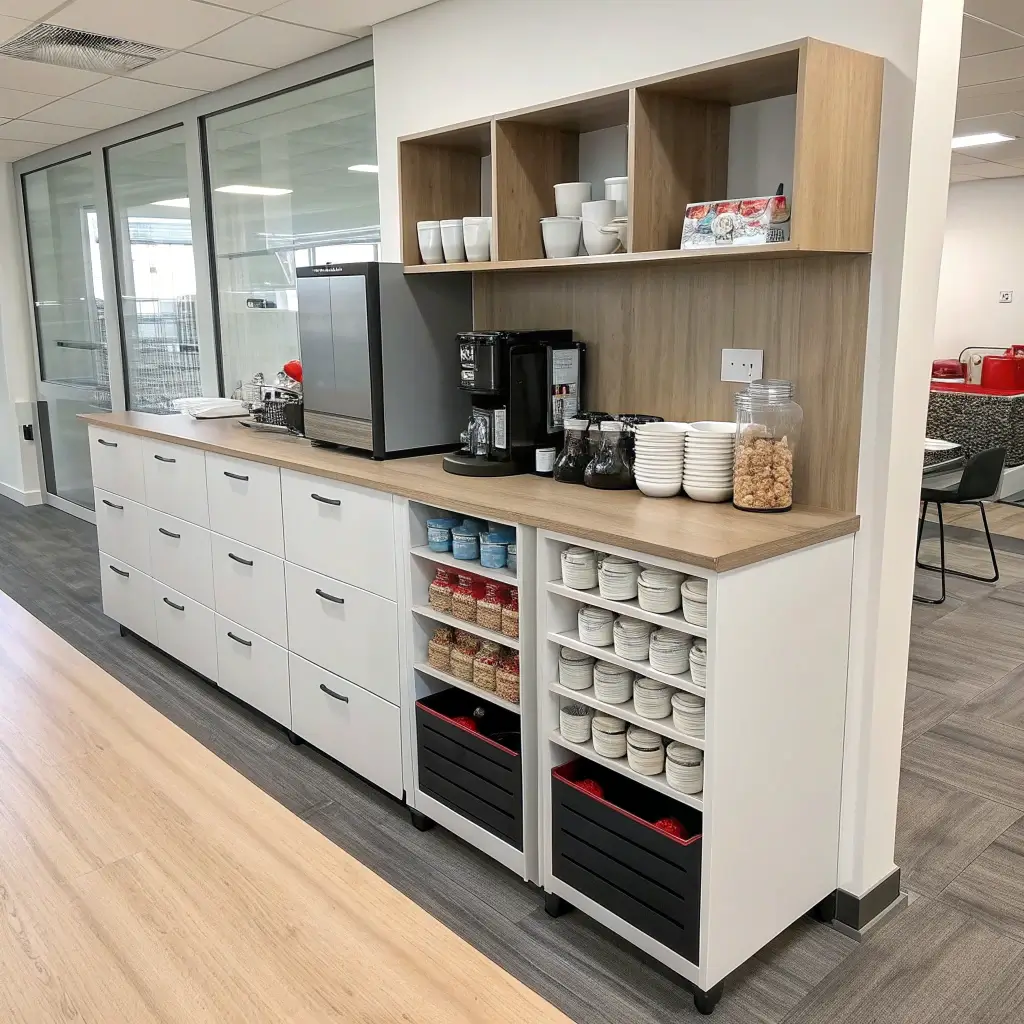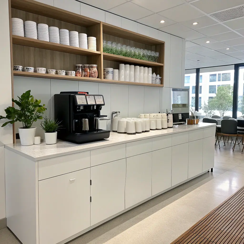 A cluttered coffee bar is a sad coffee bar. Built-in storage keeps everything organized and accessible while maintaining that clean, professional look. Plus, when everything has a place, people might actually put things back where they belong (okay, that might be optimistic, but we can hope).