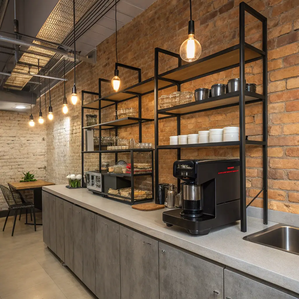The industrial look screams “we’re serious about our coffee and our aesthetic.” Think exposed brick walls, metal piping, Edison bulbs, and enough raw wood to make a lumberjack jealous. This style works particularly well if your office already has that startup vibe going on.
