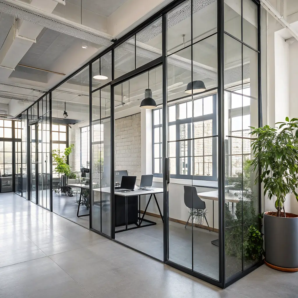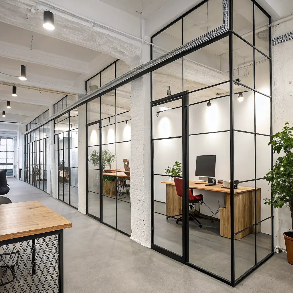 Clear glass panels work beautifully when you want to separate spaces without making anyone feel boxed in. Picture this: you can see your team working, maintain visual connection, but still have defined areas for different functions. Perfect for managers who want to keep an eye on things without being that creepy boss who hovers.