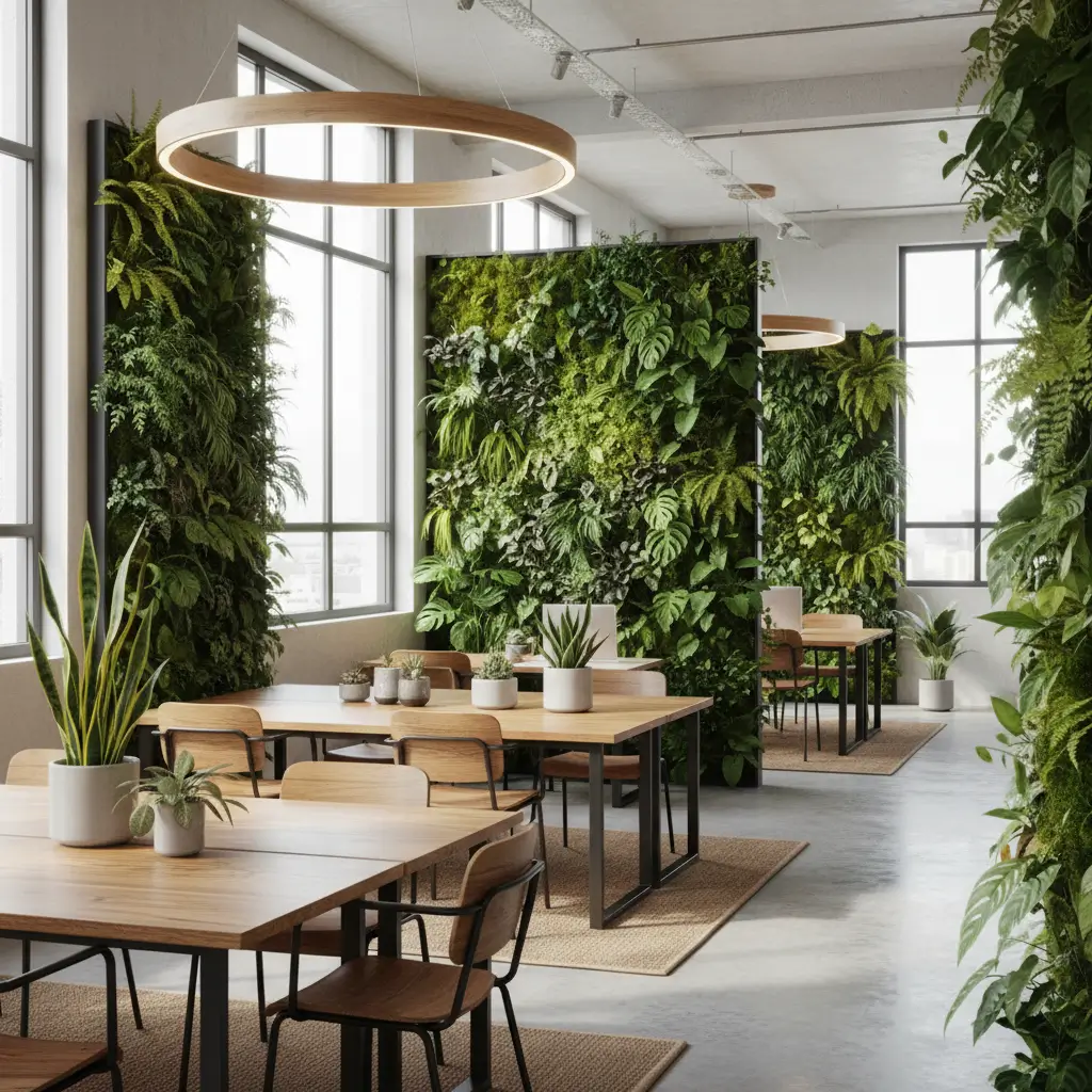 Modular plant walls combine the benefits of living partitions with the flexibility of movable systems. These units can be reconfigured as needed while maintaining the natural benefits of plant-based dividers.