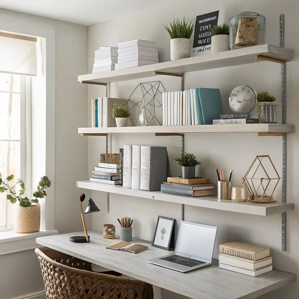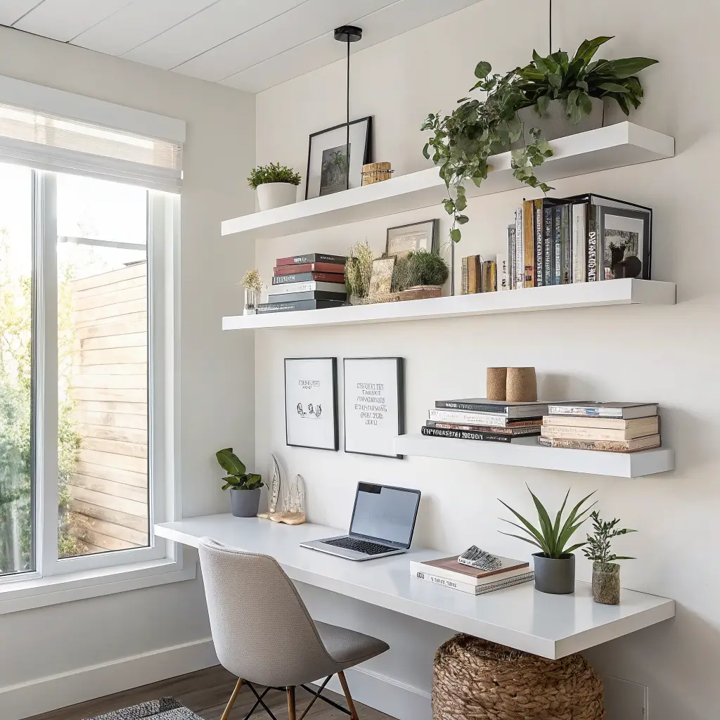 I’m starting with my personal favorite because these babies changed my office game completely. Floating minimalist shelves create this illusion that your stuff is just hovering on the wall – no visible brackets, no bulky supports, just clean lines and pure functionality.