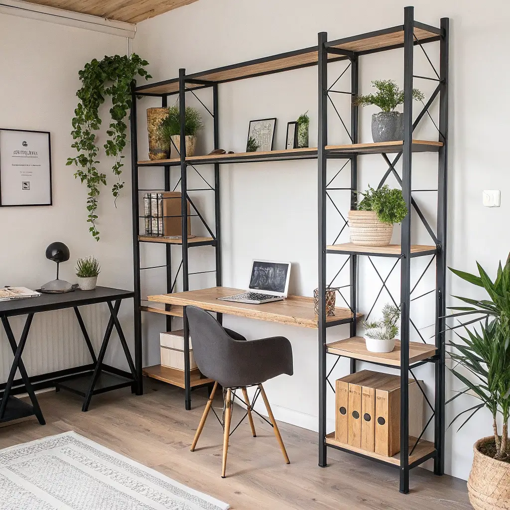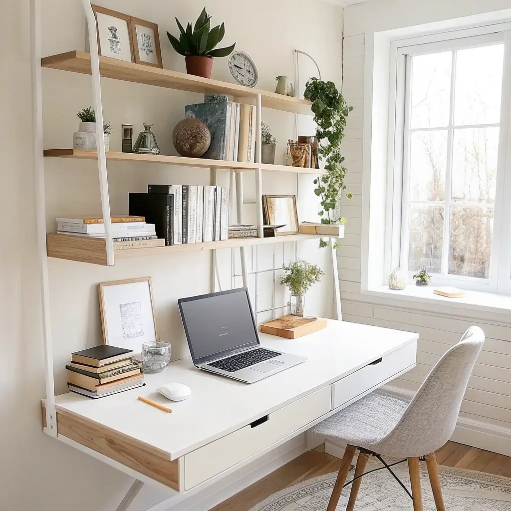 Think about what drives you crazy about your current setup. No desk space? Go for floating desk combos. Hate drilling? Ladder shelves are your friend. Want to show off your style? Geometric or glass display shelves make statements.