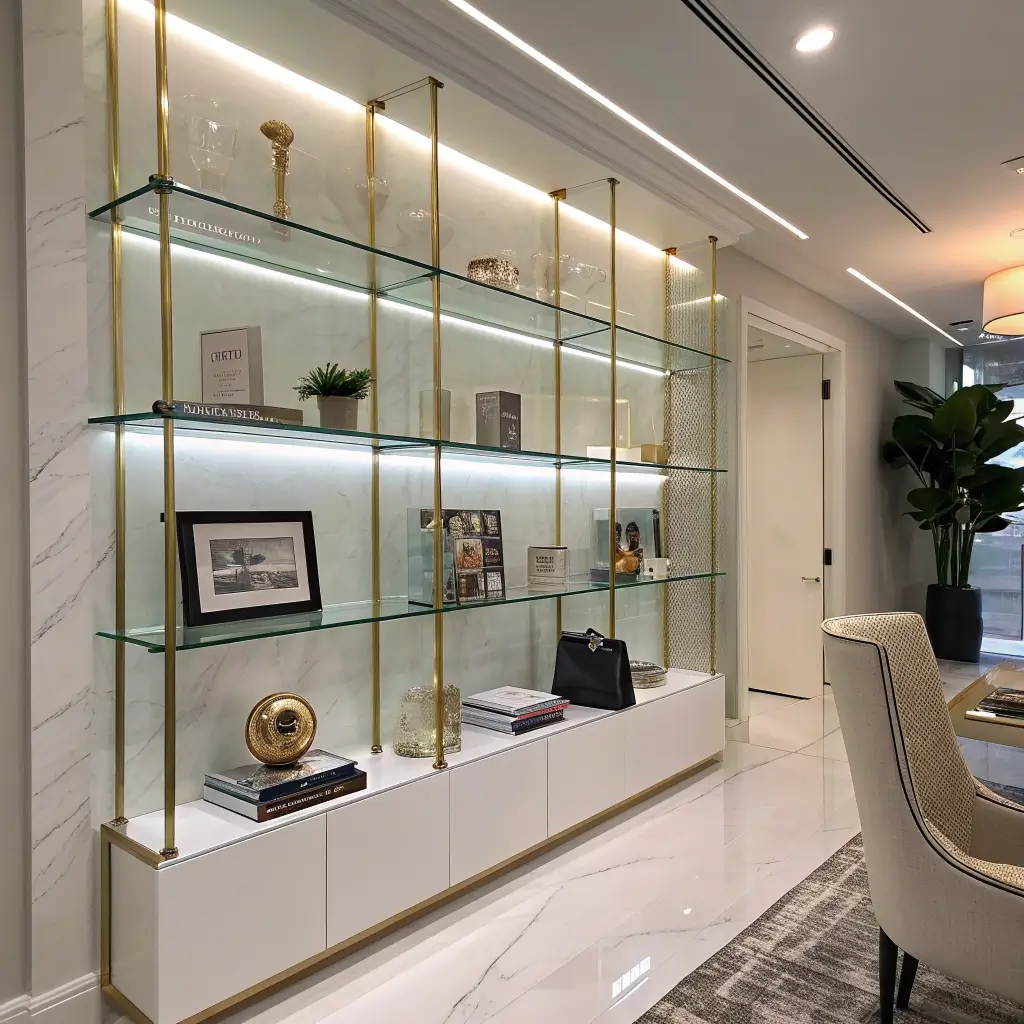 Want to make your office items look like they belong in a high-end boutique? Glass shelves with integrated lighting create that premium display feel. They’re perfect for showing off awards, collectibles, or anything you want to highlight.