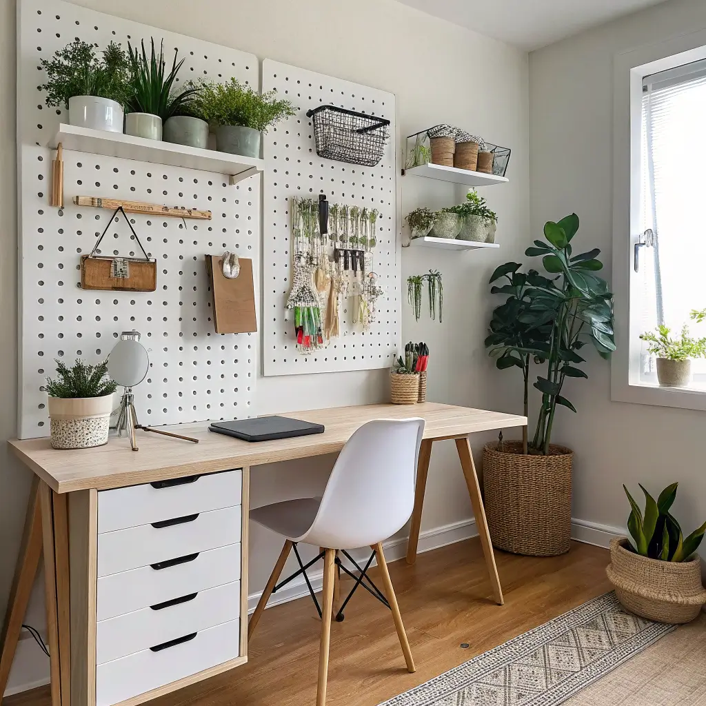 My pegboard wall started as a simple organization solution but became my favorite office feature. Painted matte black with wooden shelves and brass hooks, it looks nothing like your dad’s tool shed.