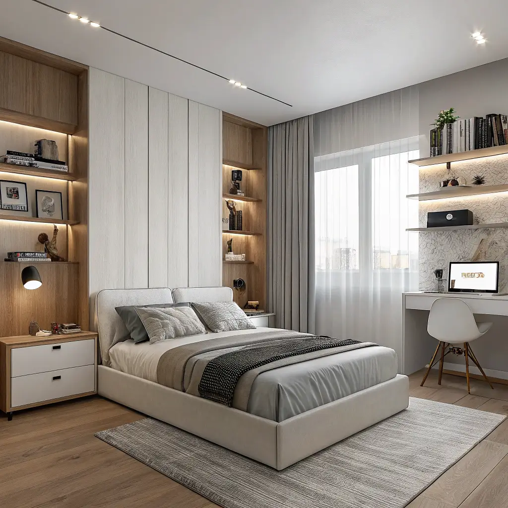 Modern furniture with sleek lines fits perfectly here. Think platform beds, minimalist desks, and streamlined storage solutions. Metallic accents in chrome or brushed nickel add sophistication without introducing color.