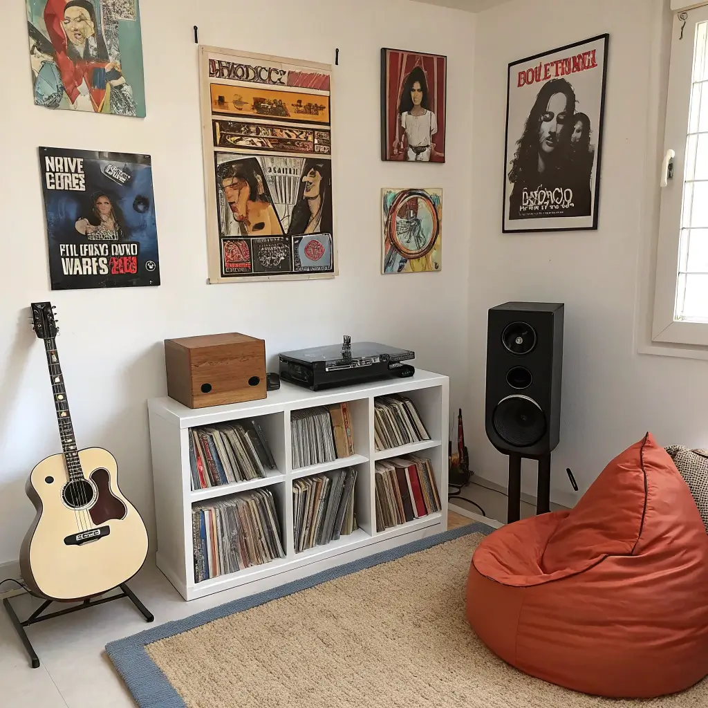 Mount guitars on the wall as functional art pieces. Install proper acoustic treatment if they actually play – your neighbors will thank you. Create a dedicated listening corner with a comfortable chair and quality speakers or a record player setup if they’re into vinyl (yes, it’s back).
