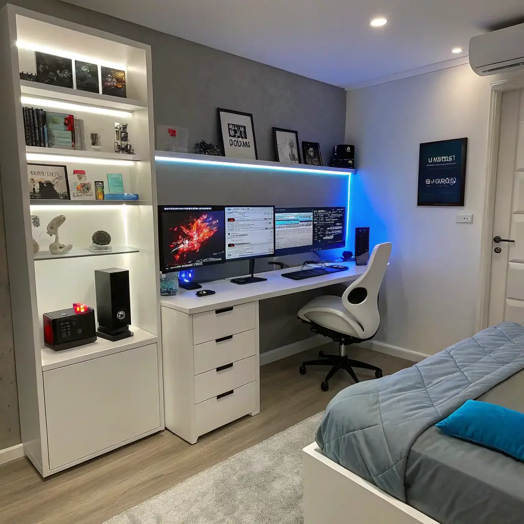 Start with the gaming setup itself. Position the desk strategically – preferably near a power outlet (duh) and away from windows to avoid glare. Invest in a quality gaming chair because posture matters, even when they’re battling zombies at 2 AM.