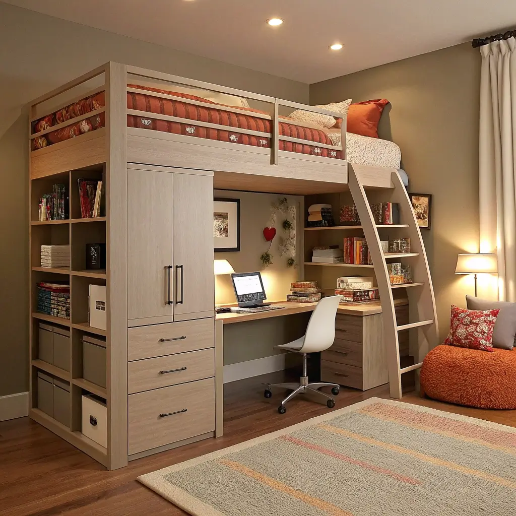 Loft beds free up floor space for a desk or seating area underneath. Storage ottomans provide seating and hide clutter. Under-bed storage boxes on wheels make accessing stored items easy.