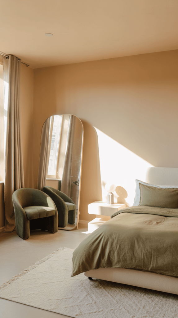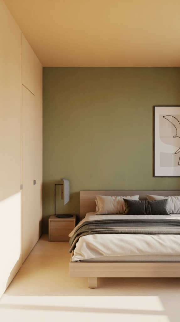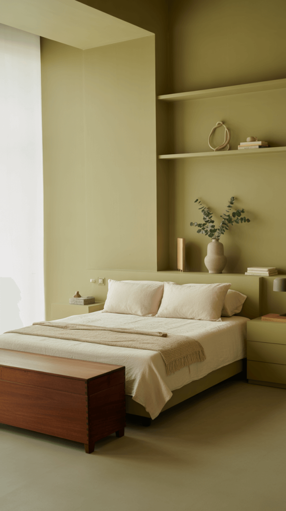 2. Cozy Olive Green and Beige Minimalist Bedroom