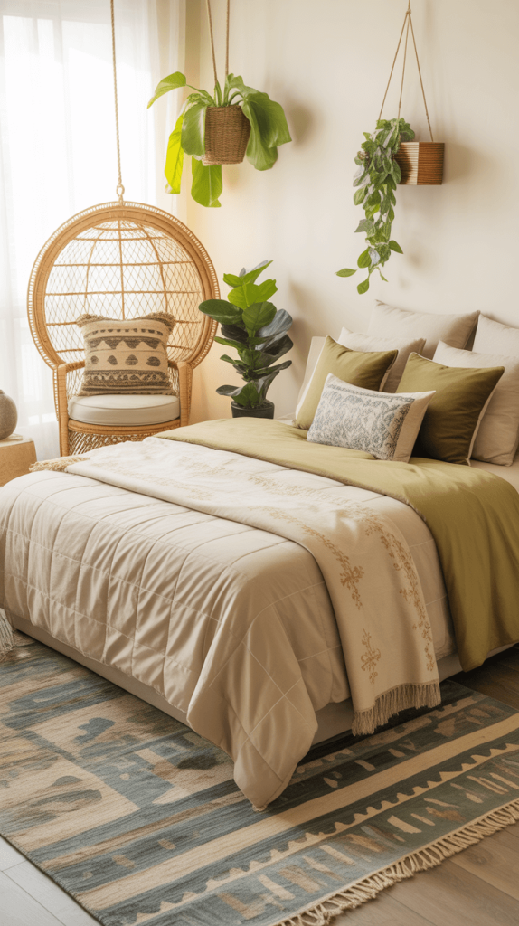3. Olive Green and Beige Boho Chic Bedroom Ideas