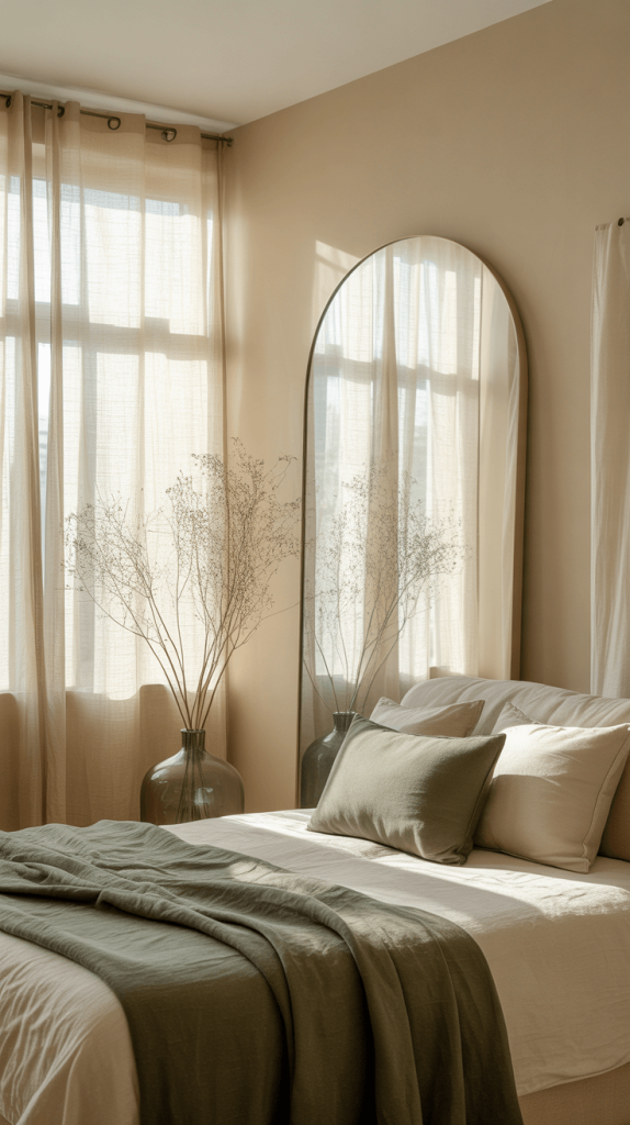 9. Olive Green and Beige Bedroom with Natural Light