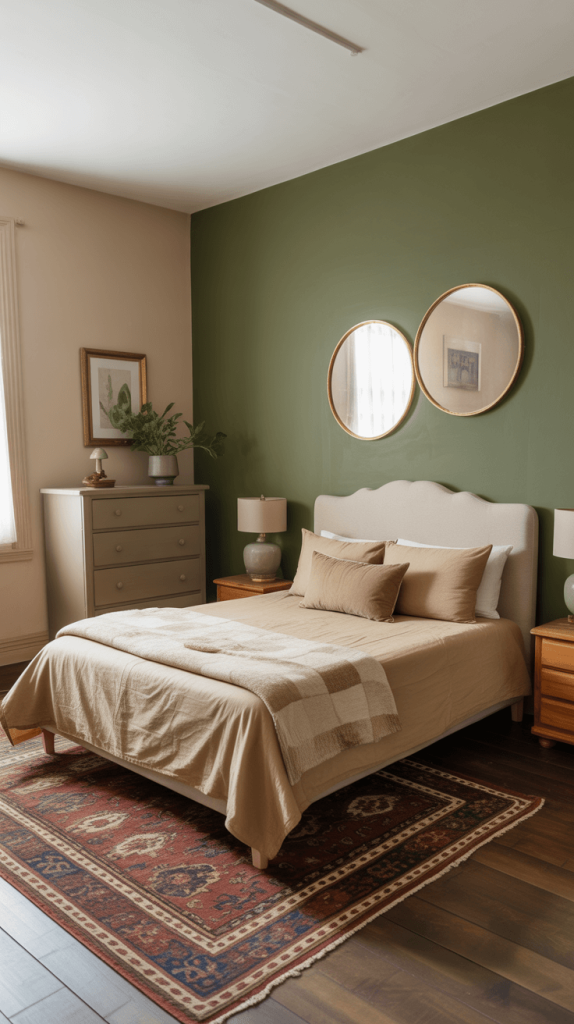 11. Olive Green and Beige Bedroom Accent Wall Ideas