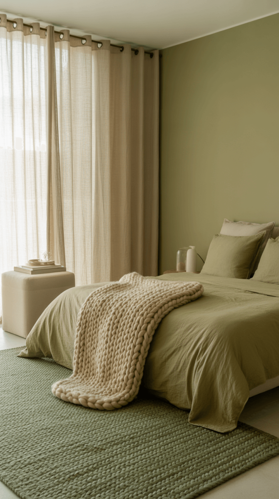 13. Olive Green and Beige Bedroom with Cozy Textures