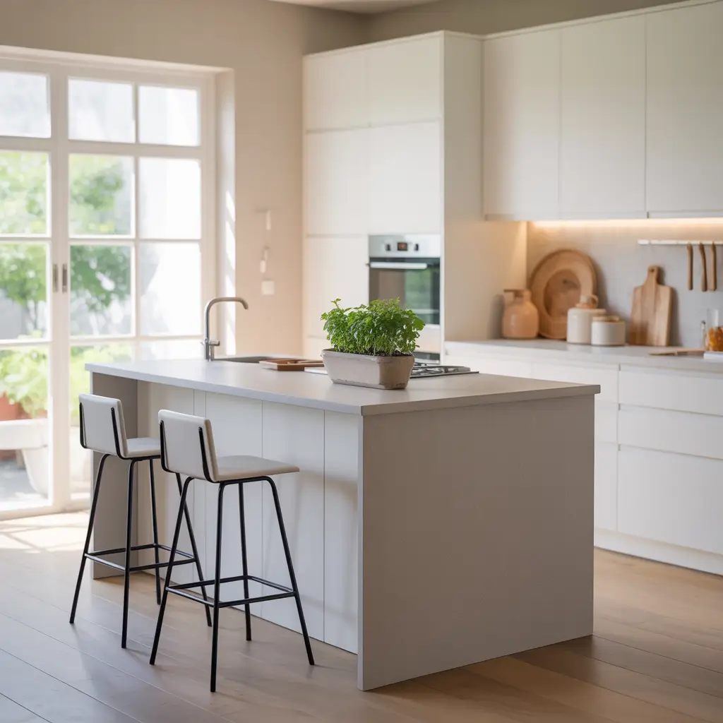Start with your color palette – whites, creams, and pale grays as your base. Then layer in natural materials like light wood, rattan, or bamboo for warmth without heaviness. Glass cabinet doors or open shelving prevent upper cabinets from feeling bulky.