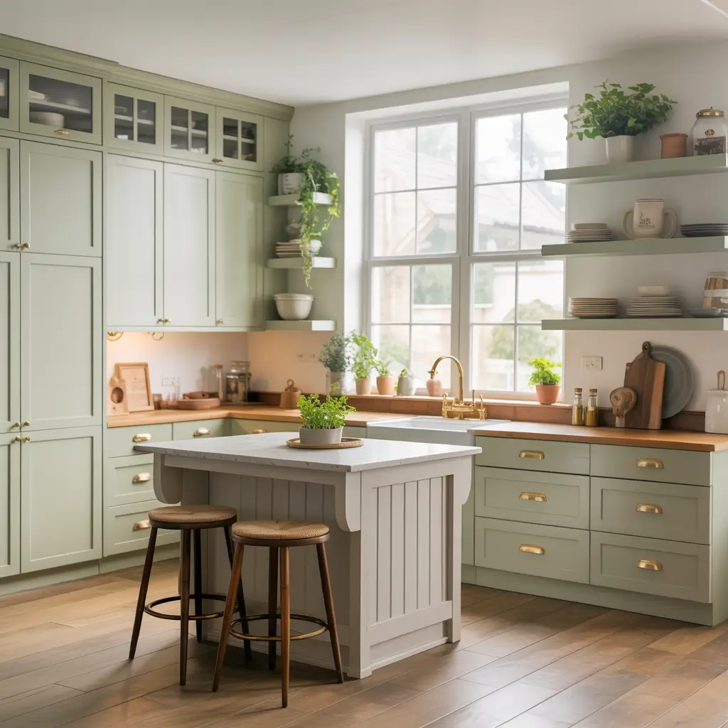 - Sage green and natural wood