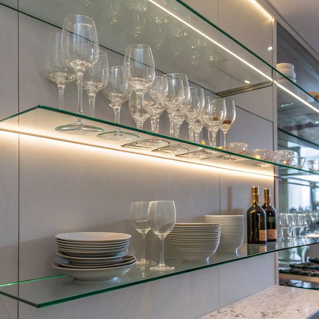 The transparency of glass means these shelves practically disappear, letting your displayed items take center stage. They’re perfect for showing off your fancy glassware, colorful dishes, or that collection of vintage teacups you inherited from grandma. Just make sure you get tempered glass – regular glass and kitchens don’t mix well.