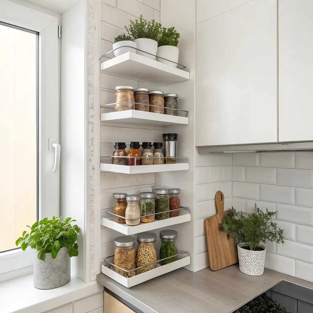 Let’s talk about the most underutilized wall space in your kitchen – that strip between your countertop and upper cabinets. Two-tier floating spice racks transform this forgotten zone into organizational gold. No more digging through cabinets trying to find the paprika while your onions burn.