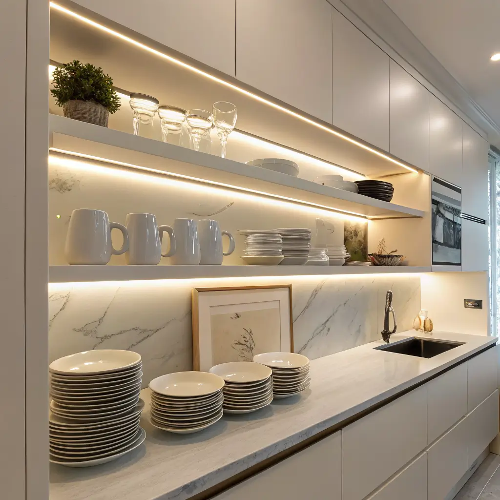Here’s where things get fancy. LED-lit shelving takes your kitchen from functional to straight-up magical. Those under-shelf LED strips aren’t just for show; they’re game-changers for task lighting and ambiance.