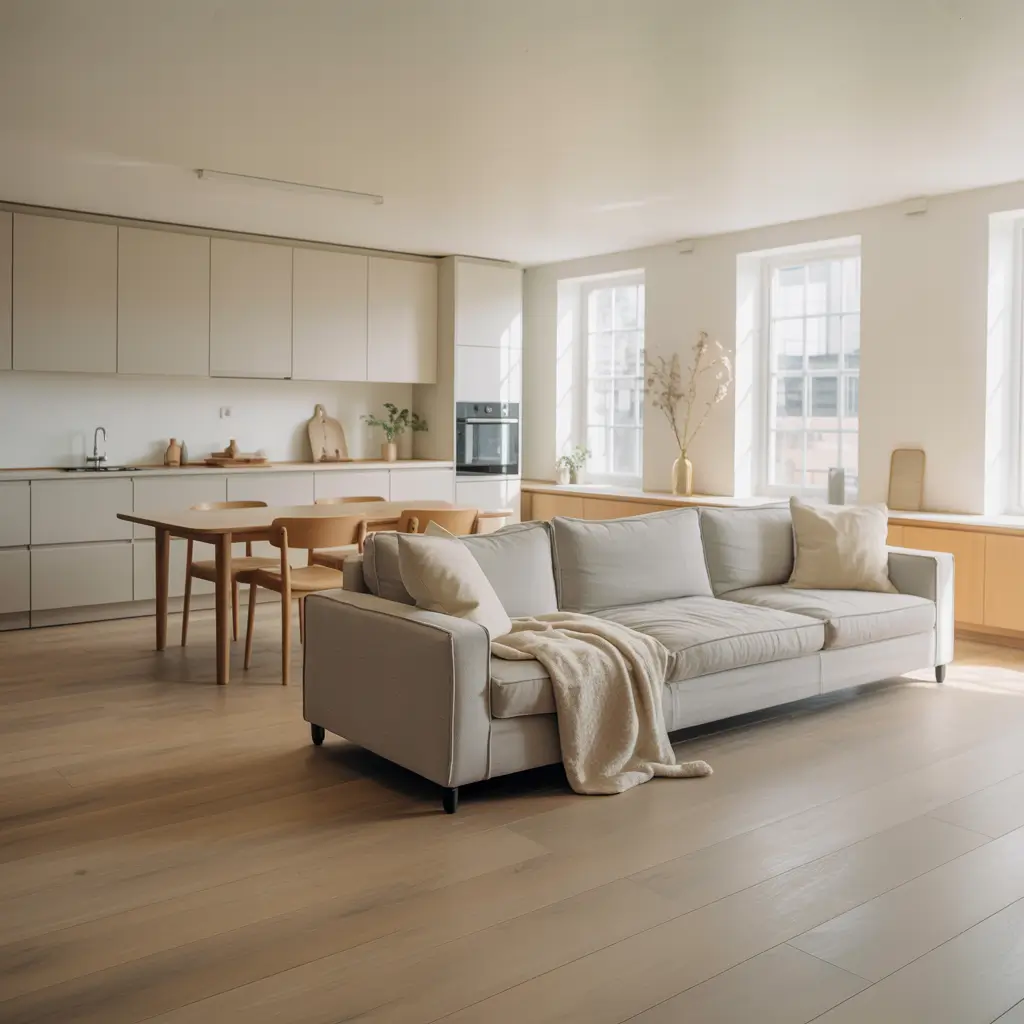 Start with a neutral base – whites and light grays dominate the walls. Then layer in natural materials like oak flooring, birch plywood furniture, and linen curtains. The kitchen features open shelving displaying simple ceramics, while the dining area hosts a solid wood table with mismatched vintage chairs.