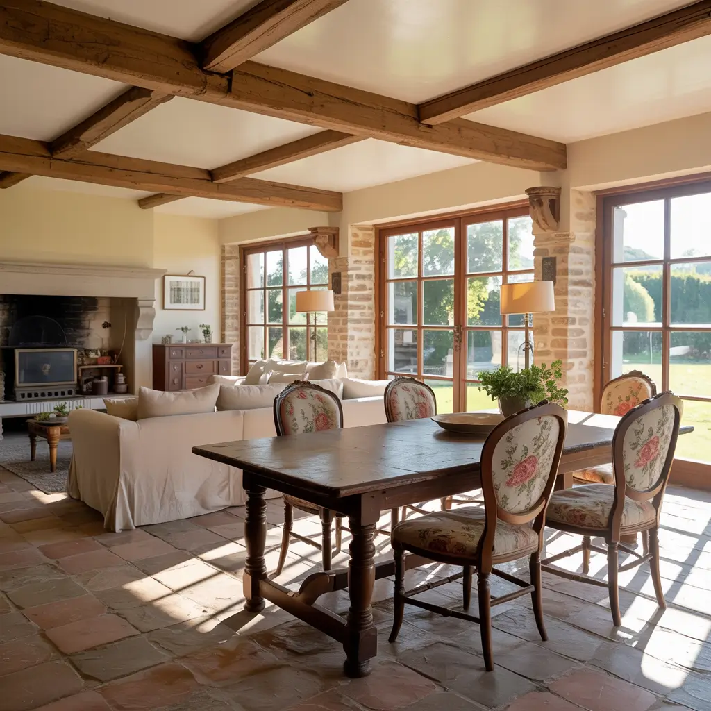 Texture becomes everything here. Mix linen curtains, wool rugs, velvet cushions, and leather accents. The kitchen might feature cream cabinets with marble countertops and brushed gold hardware. Your dining space needs upholstered chairs and maybe a grasscloth-covered accent wall.