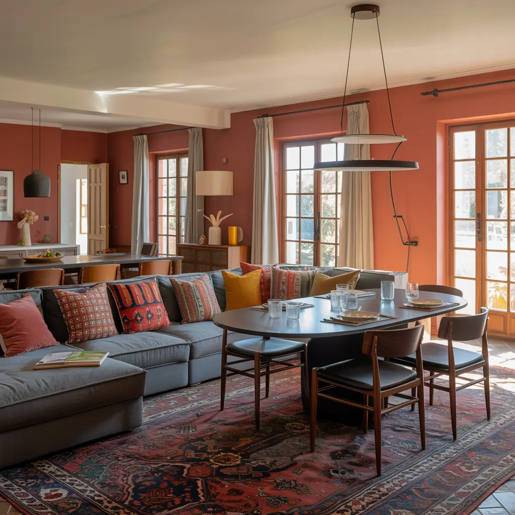Mix patterns fearlessly – striped rugs with floral cushions, geometric wallpaper with organic-shaped furniture. The key? Maintain a consistent color story throughout. Maybe you’re working with teals, oranges, and pinks – repeat these hues in different intensities across all three zones.