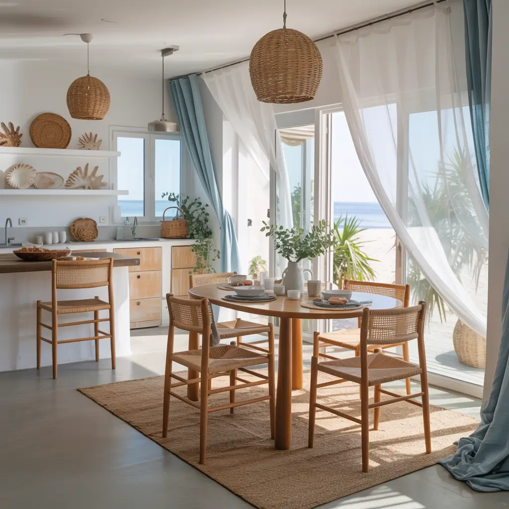 The kitchen rocks white shaker cabinets, perhaps with some glass-front uppers displaying beach-themed dishware. Subway tile backsplashes in soft blue or seafoam green add subtle color. Natural wood or whitewashed dining tables paired with woven chairs complete the dining zone.