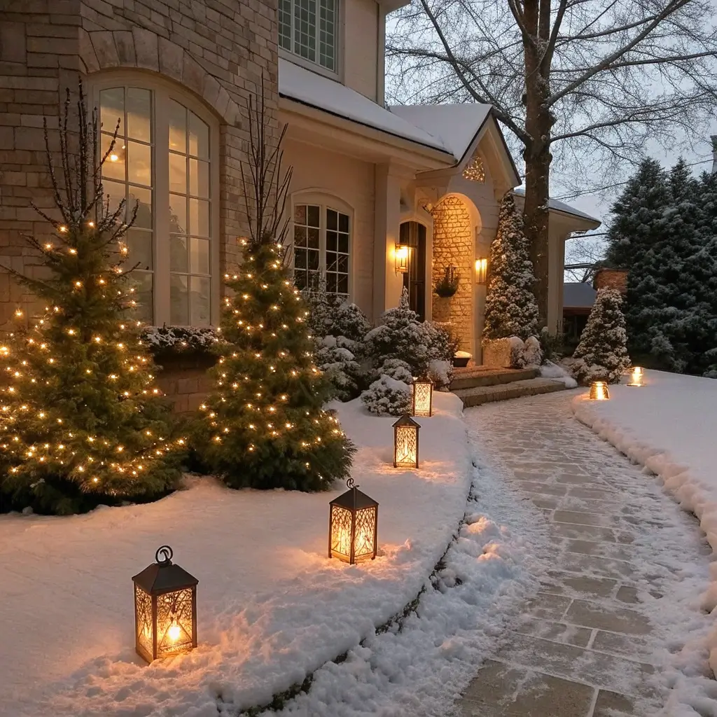 Add ground-level interest by placing white lights or rope lights along the driveway edge between candy canes. This creates a defined border that looks absolutely magical when snow falls, outlining your driveway like a fairytale path.