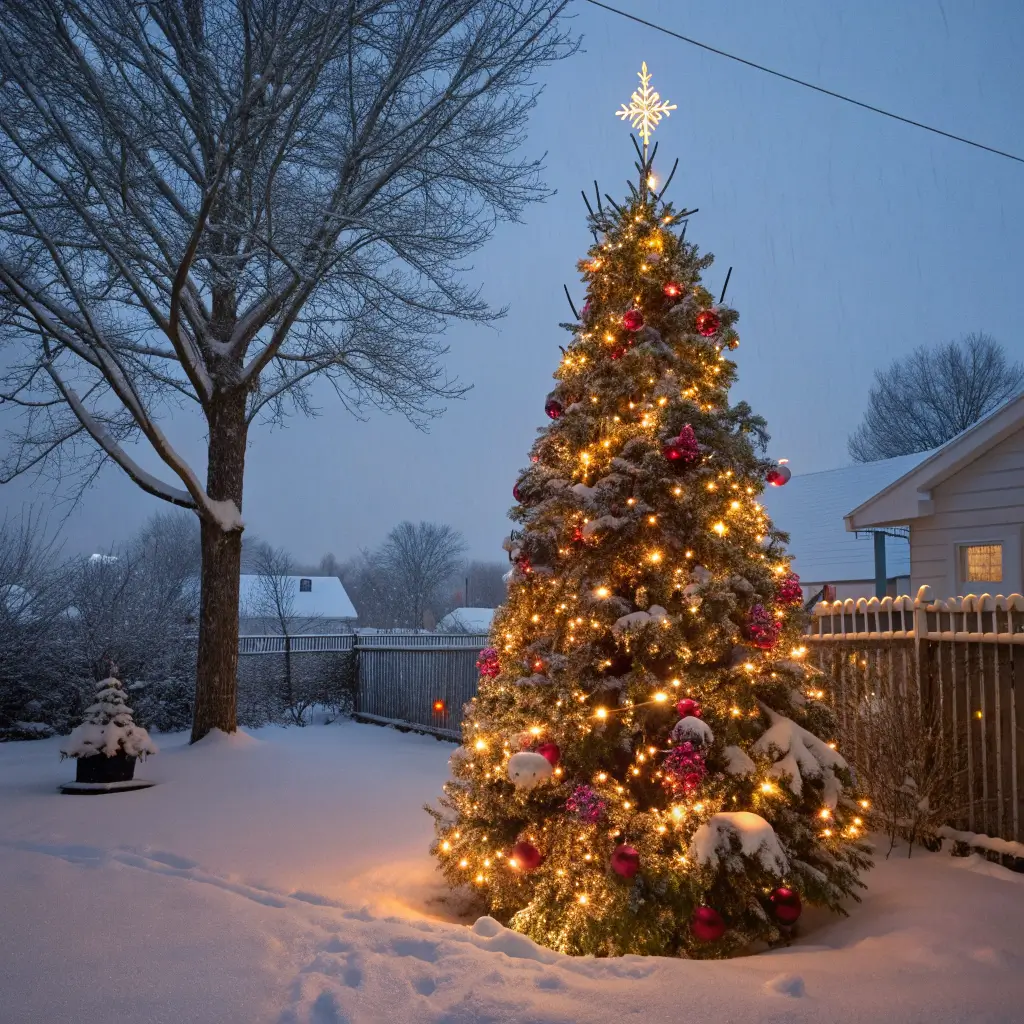Illuminated Christmas Tree Backyard Setup