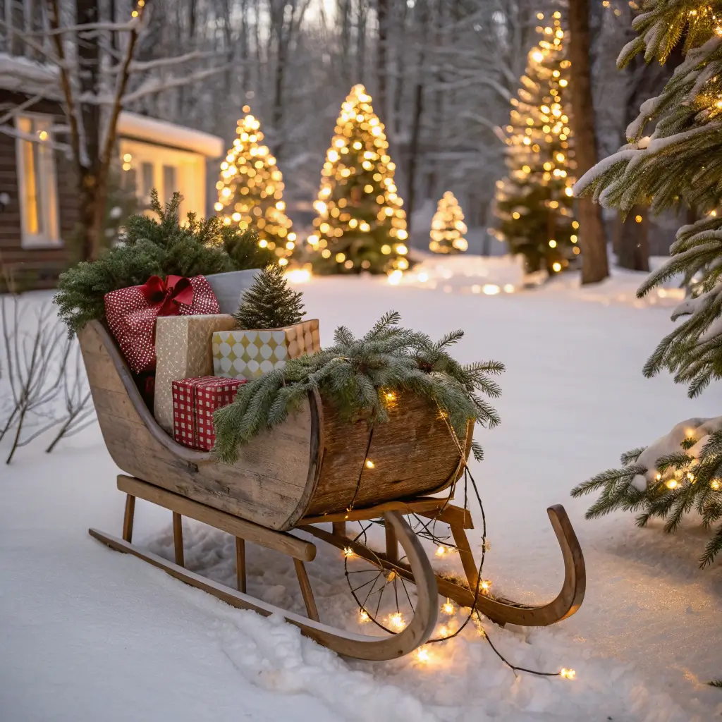 Add “reins” using thick rope or ribbon leading to nowhere—let people’s imagination fill in the invisible reindeer. Drape battery-operated lights over the sleigh’s edges and wind them through the packages. The soft glow at night creates incredible ambiance.
