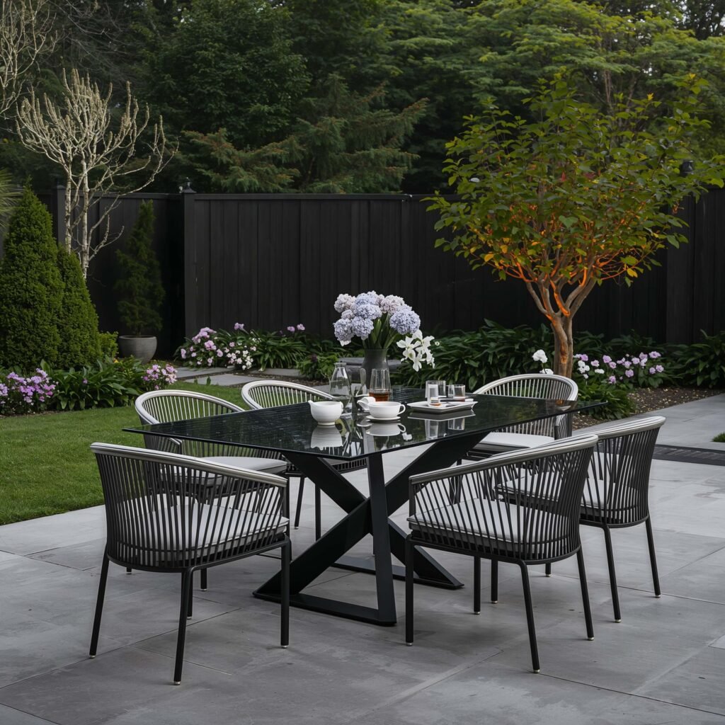 The trick with minimalist outdoor dining? Quality over quantity. You invest in one stunning table that becomes the focal point. I suggest sticking to a neutral color palette – blacks, whites, grays – and letting the surrounding nature provide the color pop.