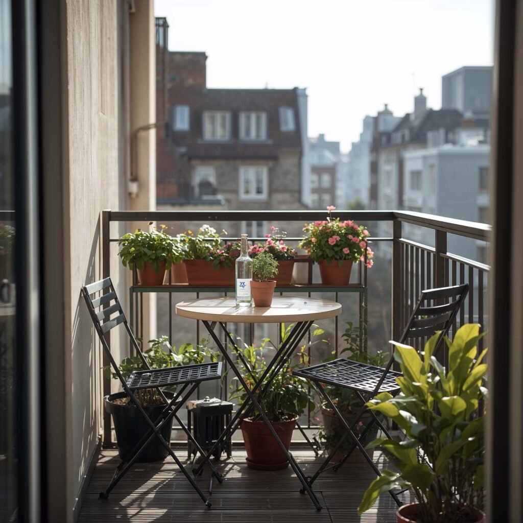 I helped my sister set up her 6×8 balcony with a wall-mounted drop-leaf table that folds completely flat when not in use. Genius, right? When she has guests, it transforms into a proper dining spot for four people.
