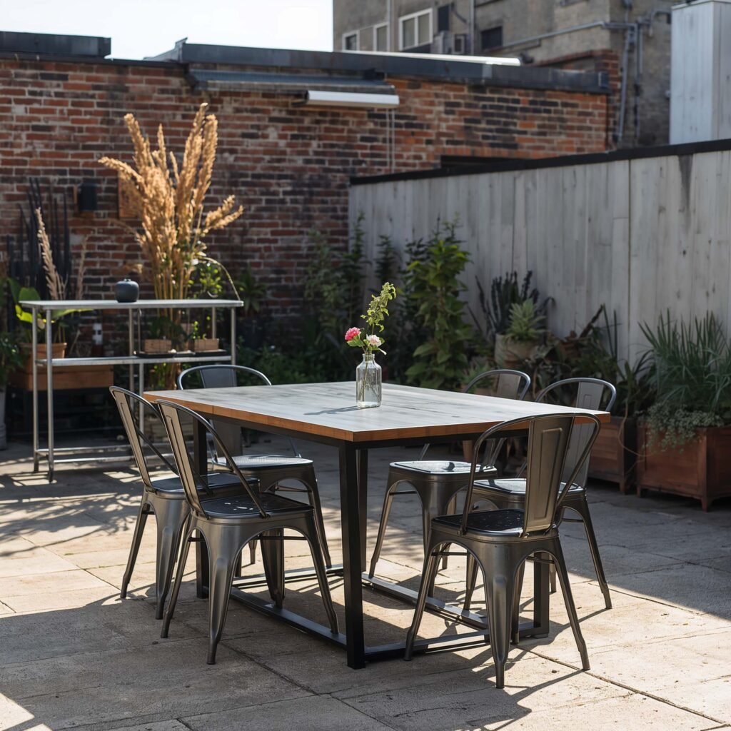 Industrial style brings that cool, urban edge to outdoor spaces. Think exposed metal, raw finishes, and that slightly unfinished look that somehow feels completely intentional. My neighbor has this incredible industrial setup with a steel pipe base and reclaimed wood top that I’m honestly jealous of.