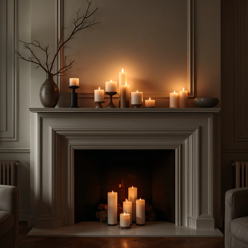 I learned this technique from a friend who’s basically the candle whisperer. Her fireplace mantel looks like something out of a magazine, and the best part? She changes up the arrangement seasonally, so it never gets boring.
