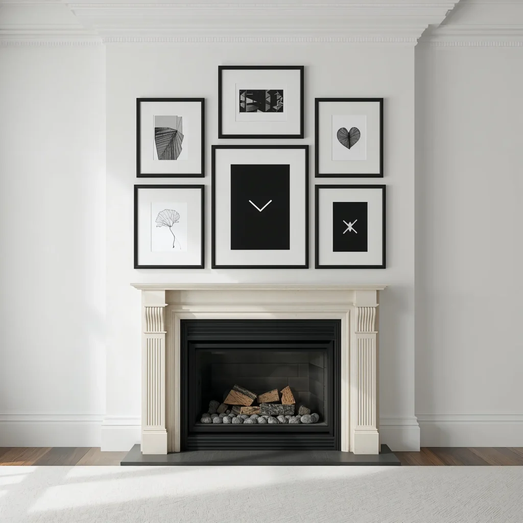 The secret to a successful gallery wall above a fireplace is consistency in framing. Black frames create a cohesive look that lets your photos and artwork shine without the frames themselves becoming a distraction.