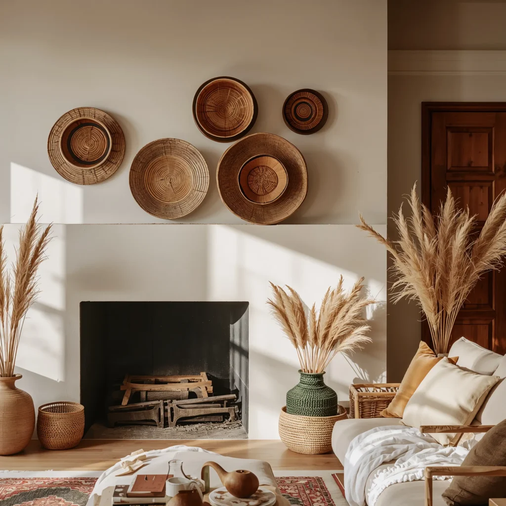 Boho style gets a lot of flak for being “too much,” but when done thoughtfully, woven basket arrangements can add incredible texture and warmth to your fireplace wall. It’s like bringing a piece of global craftsmanship into your living room.