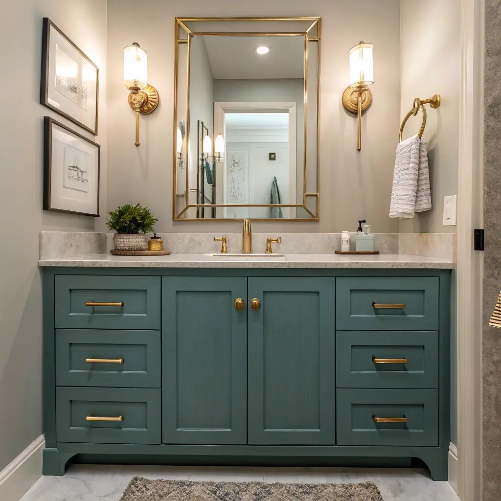 If sage green is the friendly neighbor, hunter green is the mysterious stranger you can’t help but notice. This rich, jewel-toned color screams luxury and makes even the cheapest vanity look expensive.