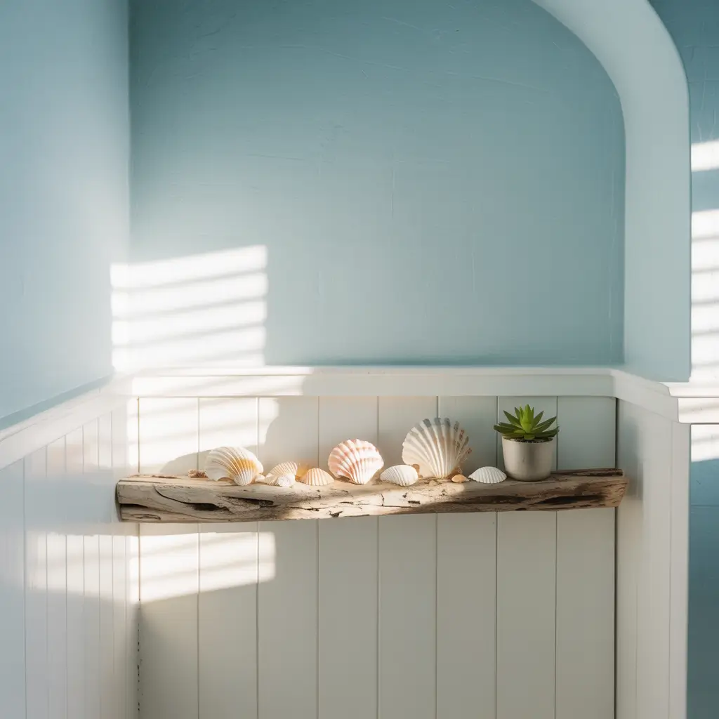 Mix your pale blue with sandy beiges and crisp whites. Add some weathered wood elements – maybe a driftwood mirror frame or reclaimed wood shelving. The goal is “expensive beach house,” not “souvenir shop explosion.”