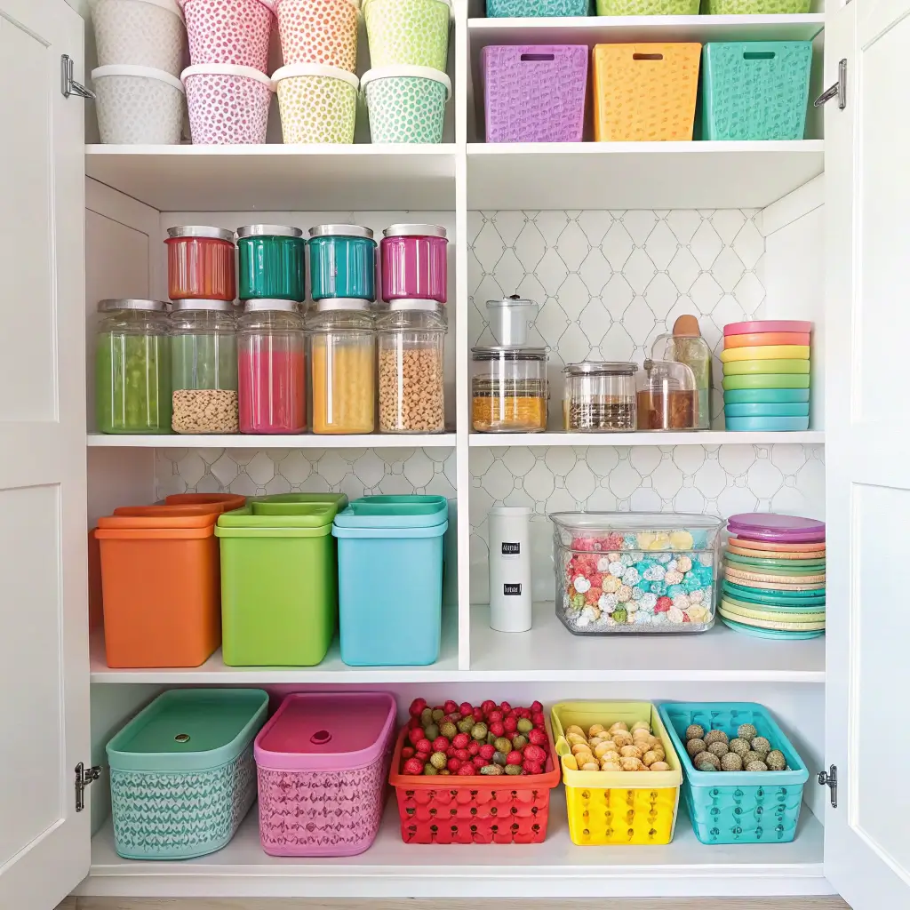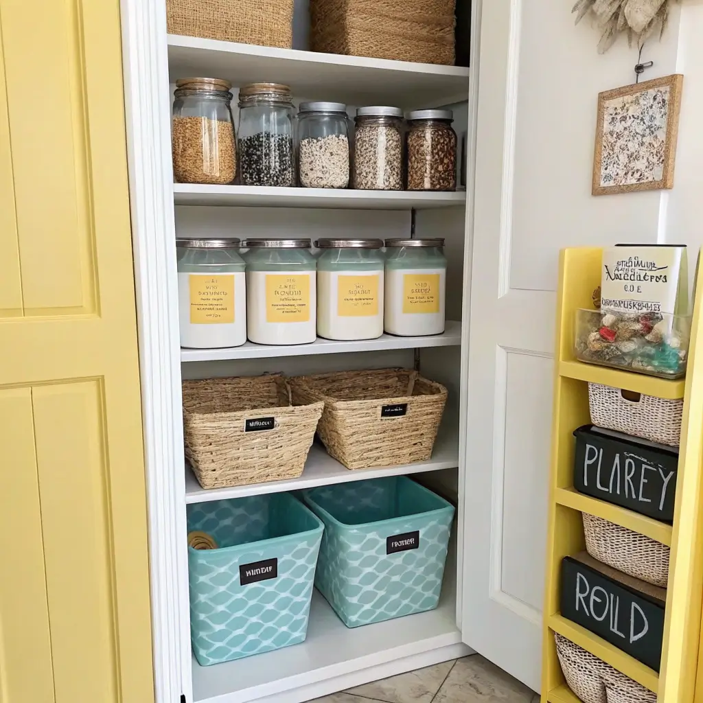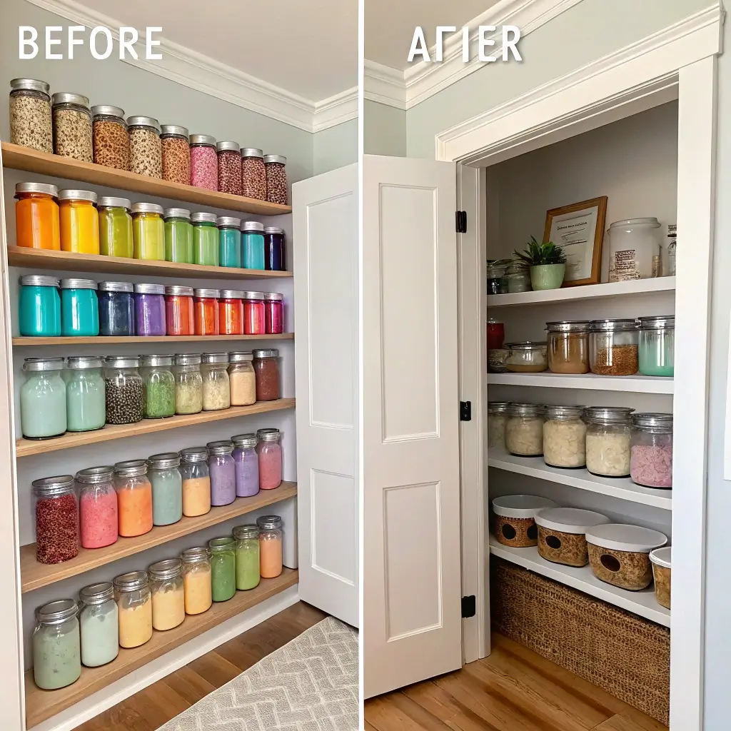 Group items by color for an unexpectedly satisfying look. All your red sauces together, green items in another section – it sounds weird, but color blocking makes your pantry look like a work of art.