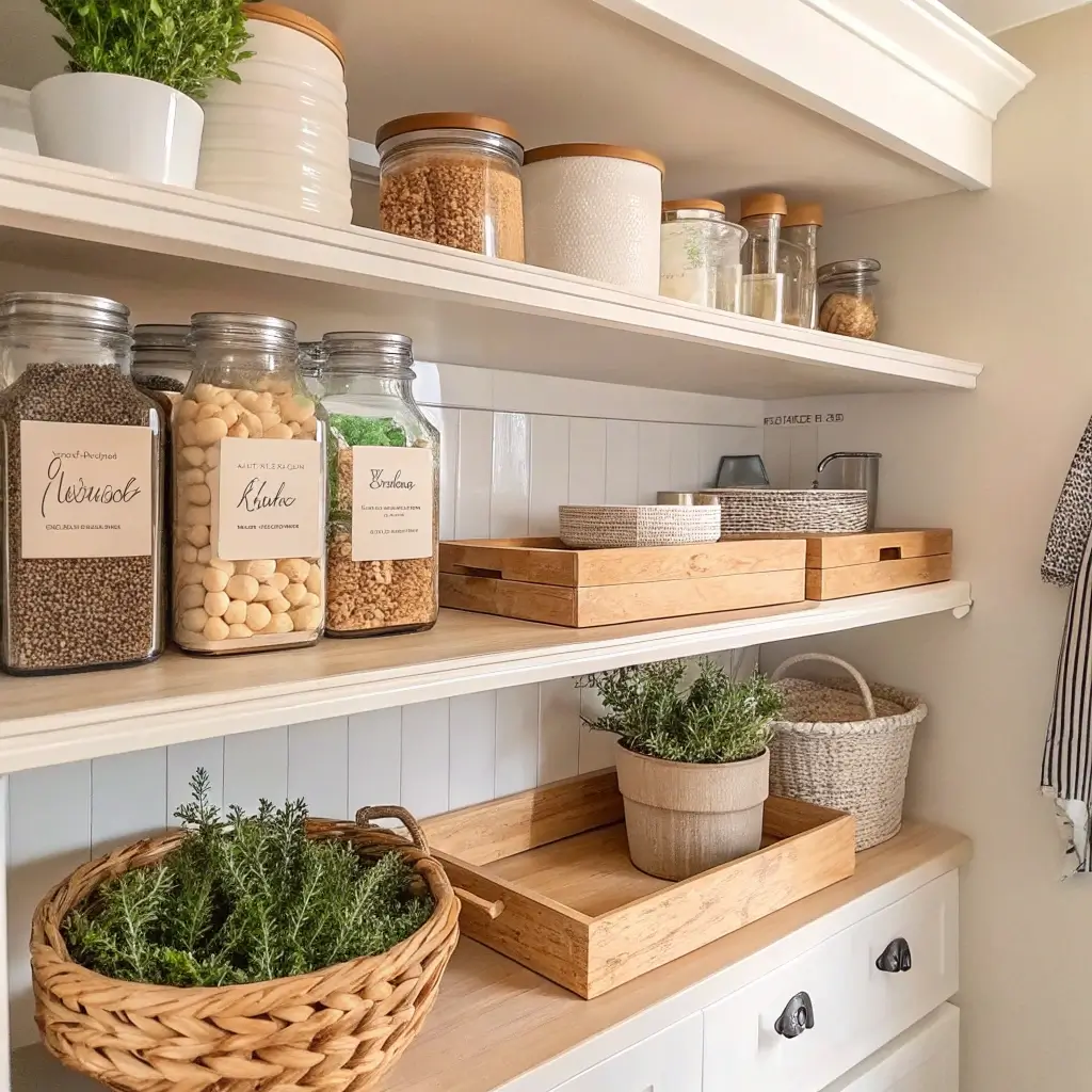 Create breathing room between items. Cramming stuff onto open shelves looks cluttered, not organized. Aim for that boutique grocery store vibe where everything has its place and some space around it.