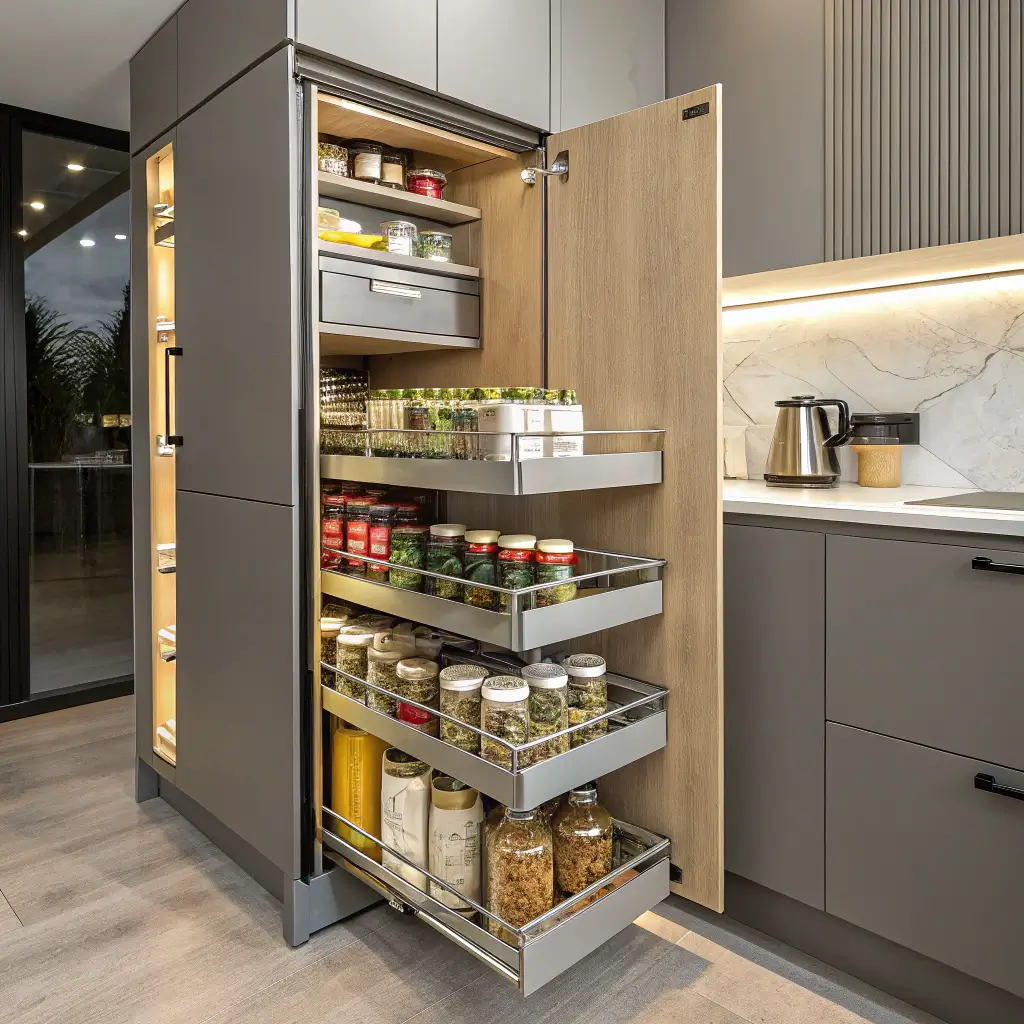 Ever seen those narrow pull-out pantries that fit between appliances? They’re brilliant for small kitchens. Mine fits in a 6-inch gap beside my fridge and holds all my oils, vinegars, and cooking wines.