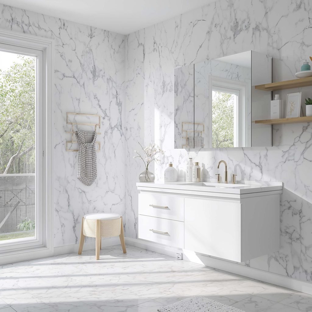 Nothing screams “I have my life together” quite like white marble walls. But who actually has marble bathroom money? Not me, that’s for sure. This is where marble-look peel and stick wallpaper becomes your best friend.