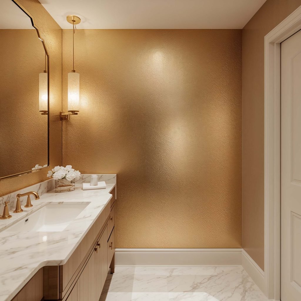 Sometimes you need a little glamour in your life, and metallic wallpaper delivers it in spades. Gold, copper, rose gold – pick your fighter. These papers catch light beautifully and make your bathroom feel expensive, even if your fixtures came from the clearance section.