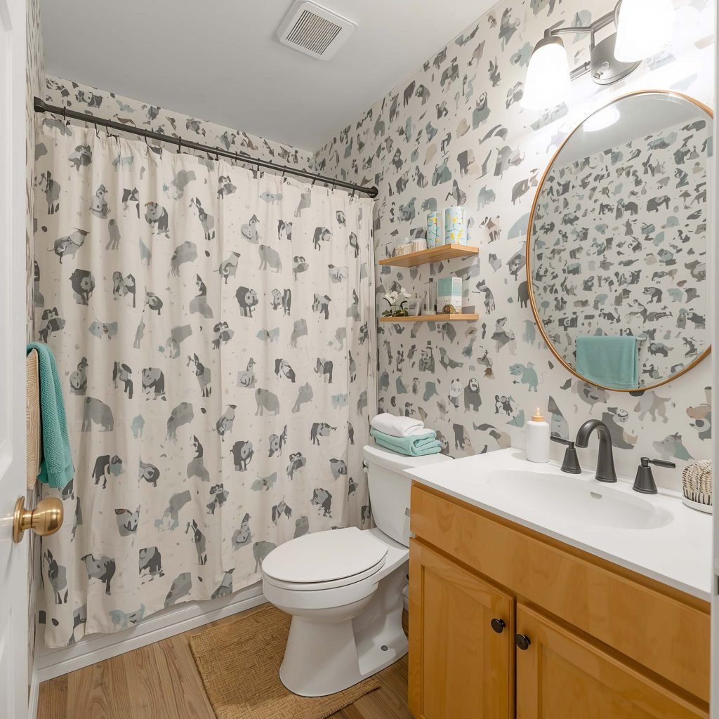 Getting kids excited about bath time requires strategy, and fun animal print wallpaper is basically parenting gold. Cartoon whales, rainbow unicorns, jungle animals – pick whatever your kid’s currently obsessed with.
