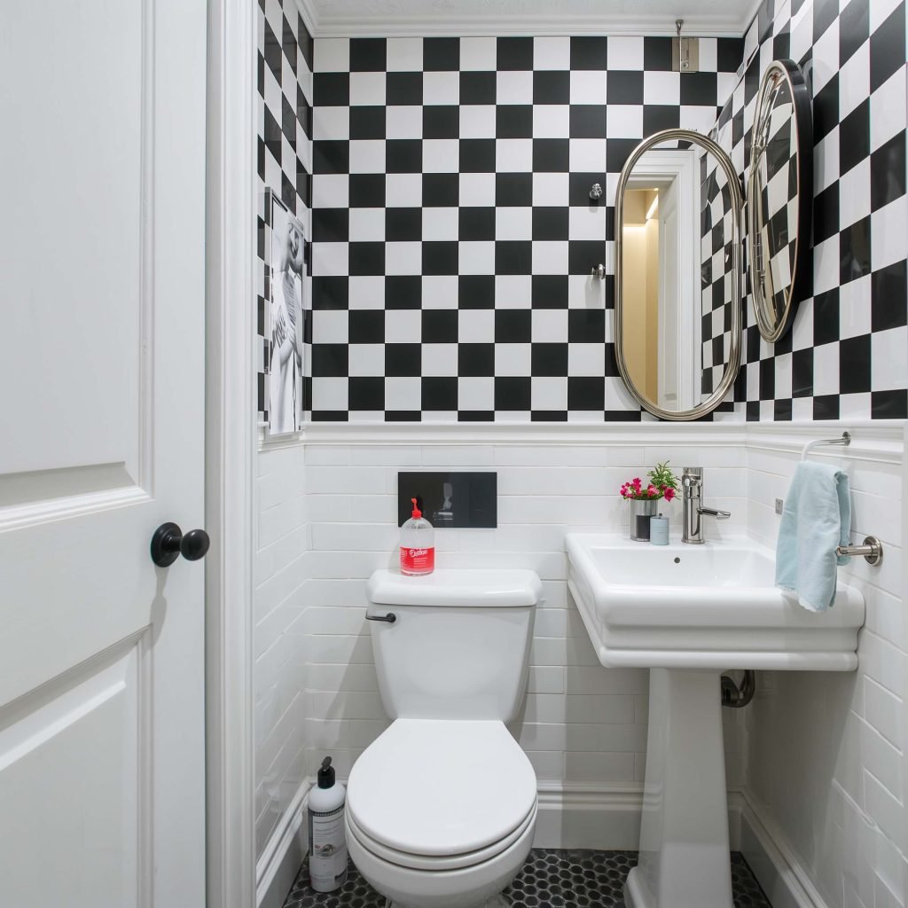 Want to really go for it? Use checkerboard wallpaper on your ceiling. Sounds crazy, but in a small powder room, it creates this jewel box effect that’s absolutely stunning. Just maybe warn your guests first :/